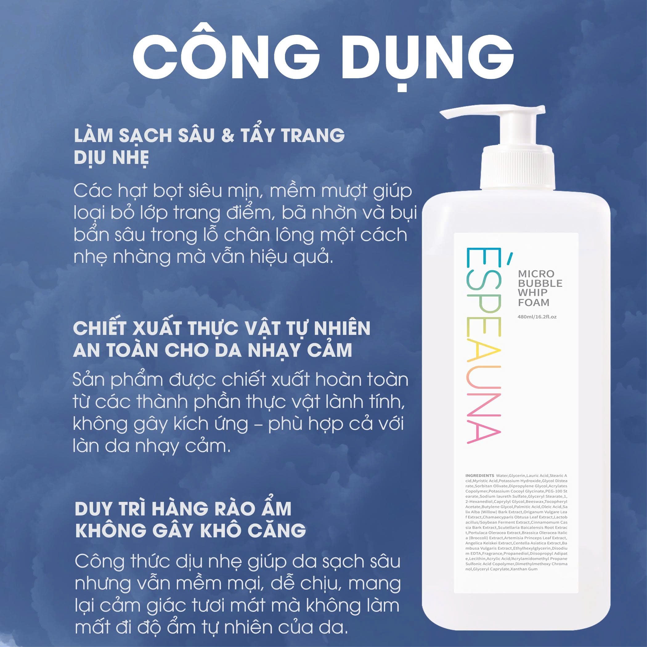 • Tạo bọt siêu mịn và dày đặc giúp làm sạch sâu lỗ chân lông